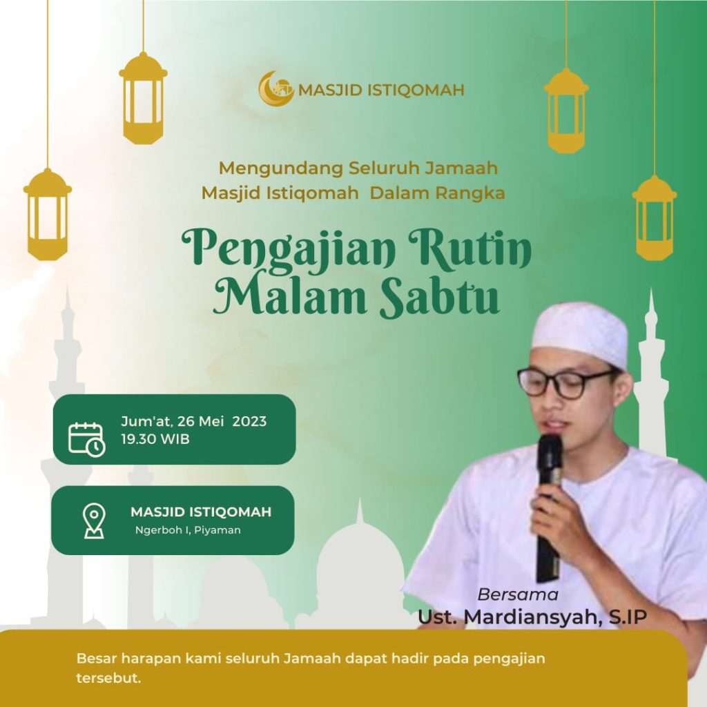 Pengajian Rutin Malam Sabtu untuk Semua Jamaah Masjid Istiqomah oleh Ust. Mardiyansah Pada Pukul 19:30 s.d Selesai